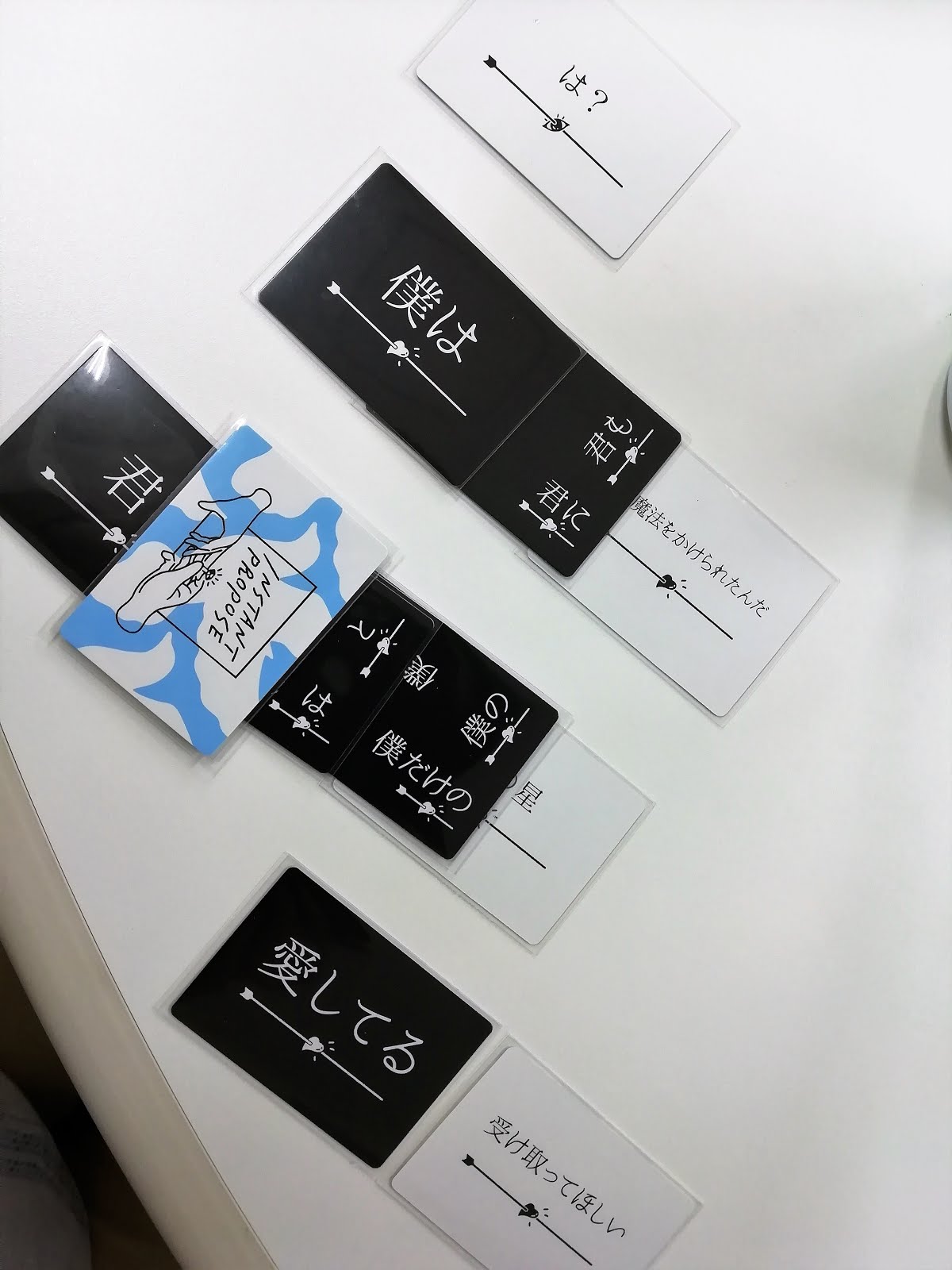 色がついた手持ちの札と、ランダムに配られる6枚の白い単語カードを組み合わせて即興でプロポーズをする!